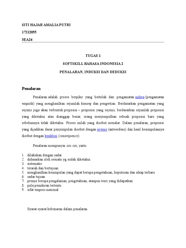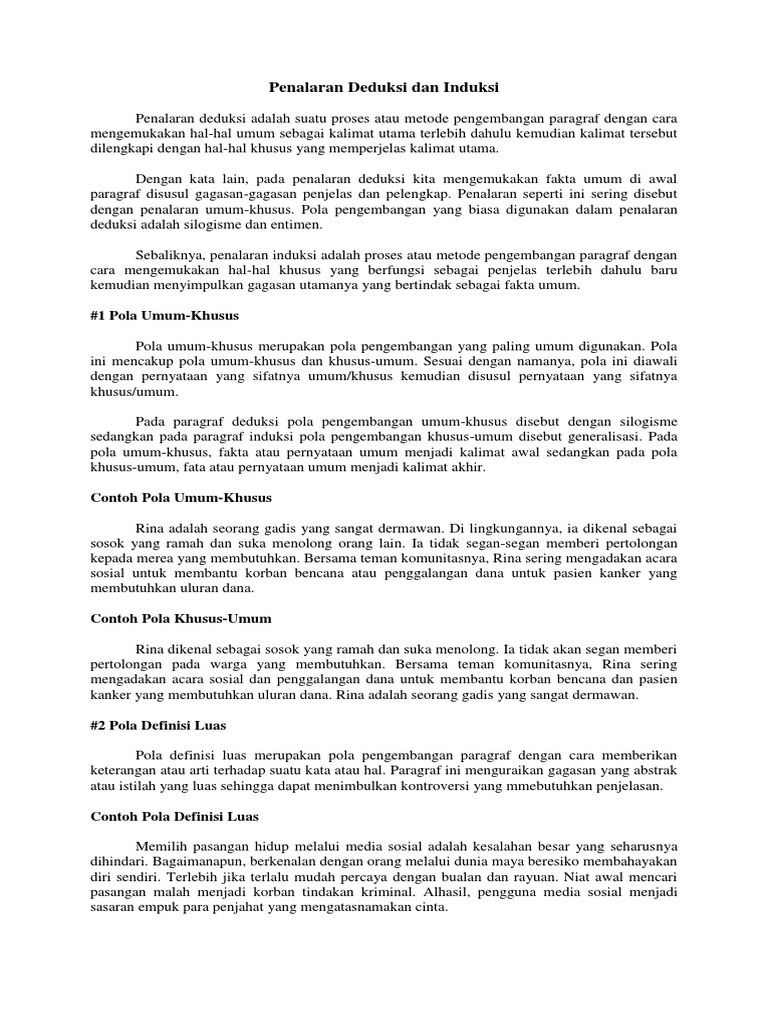 Penalaran adalah proses berpikir yang bertolak dari pengamatan indera (pengamatan empirik) yang menghasilkan sejumlah konsep dan pengertian. Jika tidak ada usaha, maka, manusia akan tidak sukses. Induktif adalah penalaran yaitu menggunakan data spesifik untuk membentuk kesimpulan yang lebih besar dan umum. Penalaran deduktif dan induktif oct.09, 2009 in bahasa indonesia 1 penalaran adalah proses berpikir yang bertolak dari pengamatan indera (observasi empirik) yang menghasilkan… Penalaran deduktif adalah proses penalaran untuk manarik kesimpulan berupa prinsip atau.