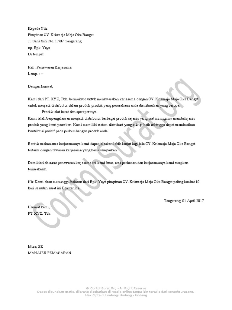 Surat diatas merupakan contoh surat penawaran kerjasama yang dikirimkan oleh pt. Dalam lingkup bisnis surat penawaran kerjasama amatlah penting dan sangat sering digunakan oleh berbagai perusahaan. Kumpulan contoh surat penawaran mulai dari surat penawaran resmi, jasa, barang, kerjasama berserta dengan pengertian dan struktur surat penawaran. Contoh surat penawaran kerjasama dalam bahasa inggris. Tujuan dibuat surat penawaran ini.